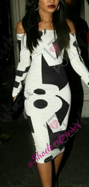Walk the runway in this off the shoulder Abstract art bodycon fitted dress! Below the knee fit, very sexy and chic! Pop some color to this item and turn heads tonight!