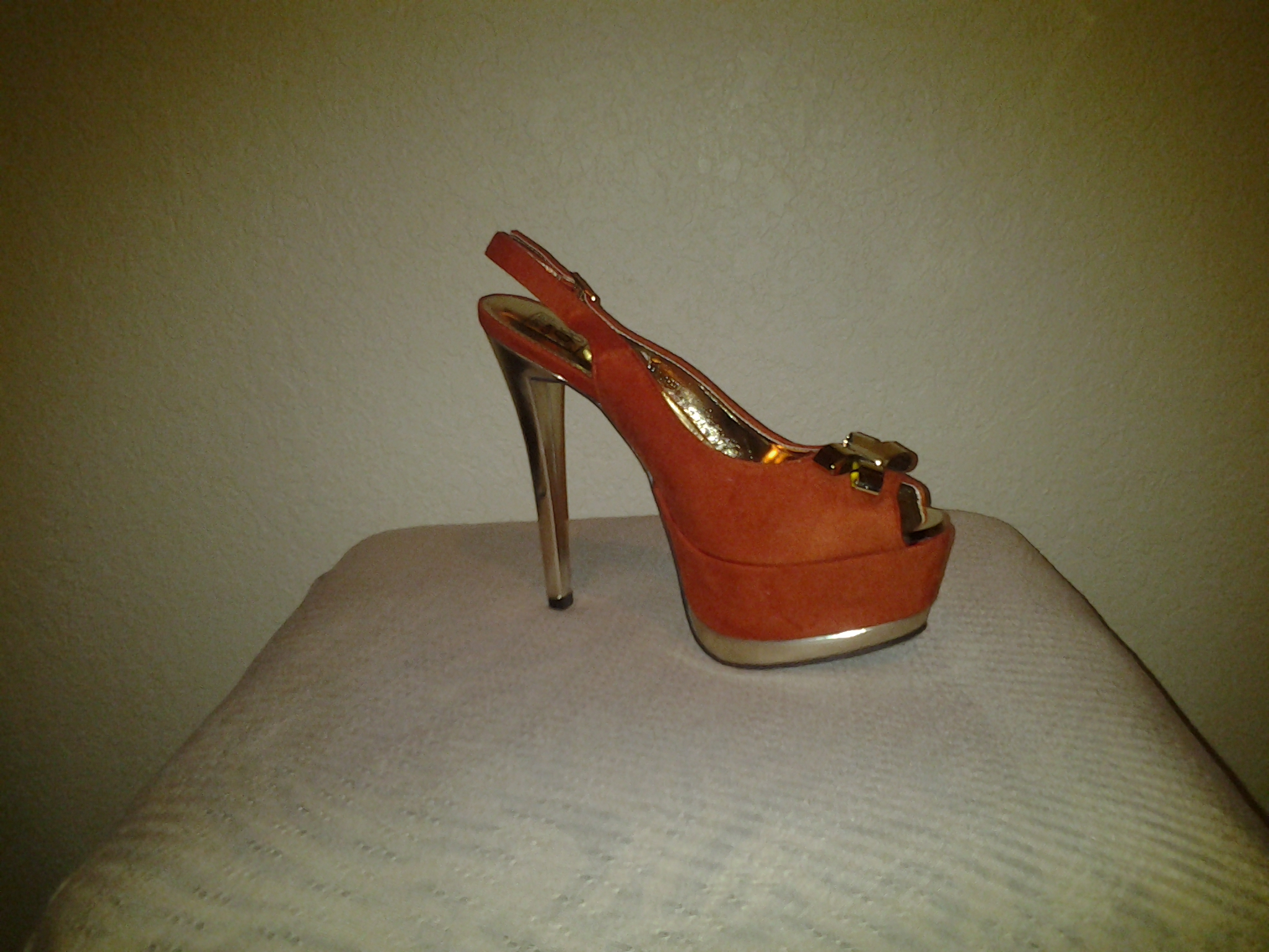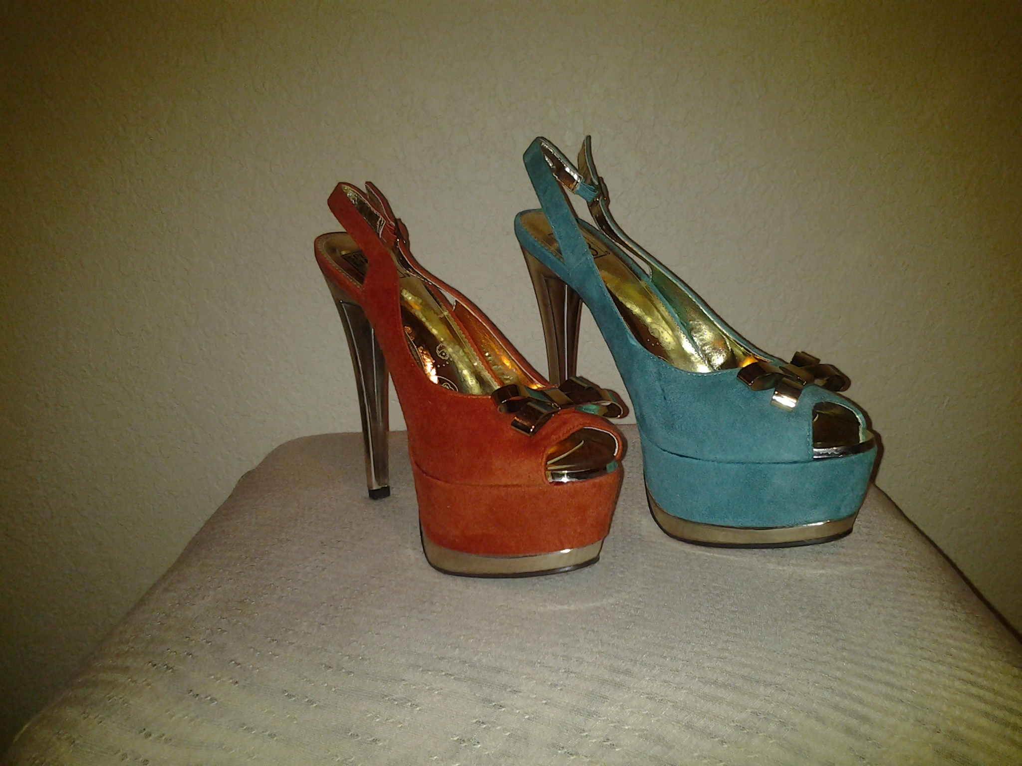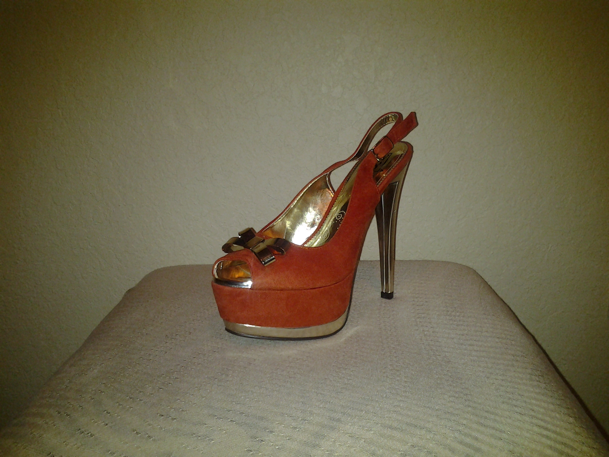 A must have Sling back style closure summertime heel with a metallic gold heel, decorated with a cute but stylish gold bow, simple yet a very sassy heel! Also available in Teal