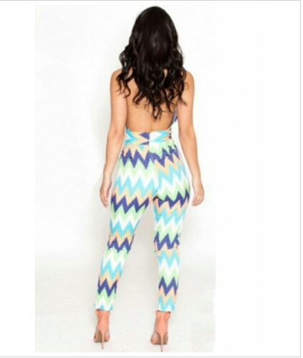This colorful summer fling zig backless jumpsuit will turn heads as you walk by with confidence! Show off your sexy curves in a most alluring way! narrow long neck, bare back and accented waistline.