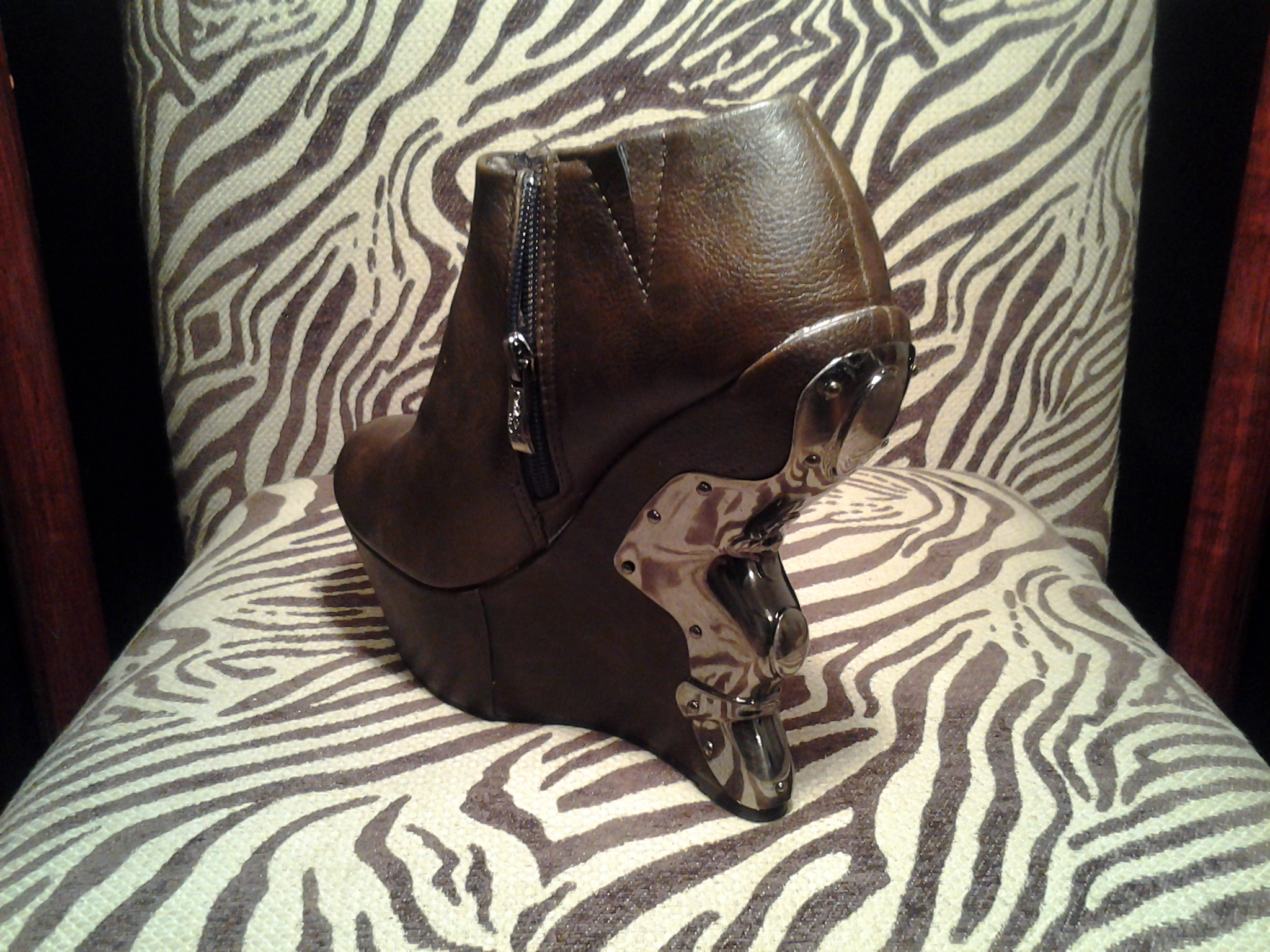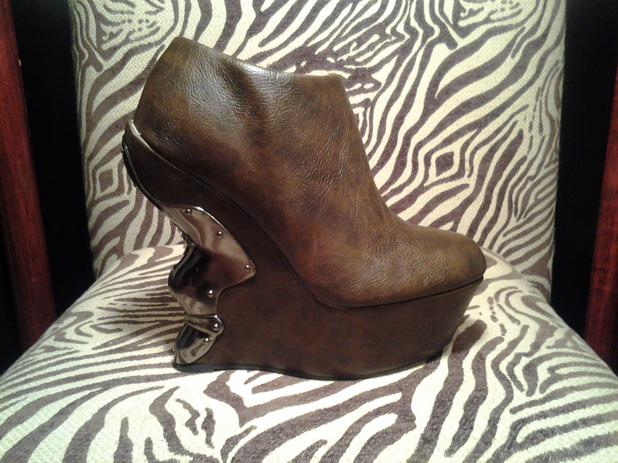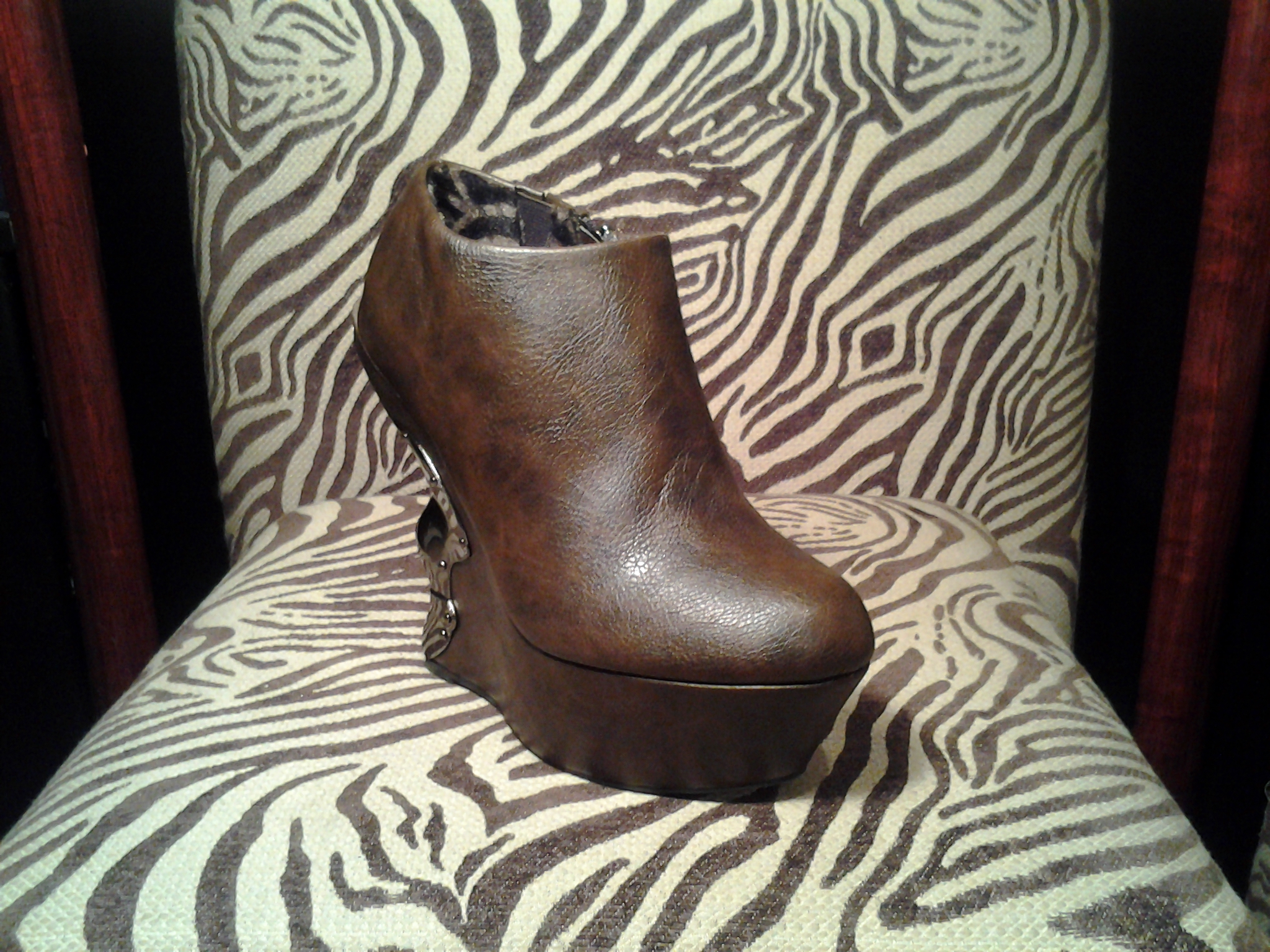 Compliment any outfit with this casual/ dressy wedgeless heel in chocolate brown featuring a pewter metal heel detailing.